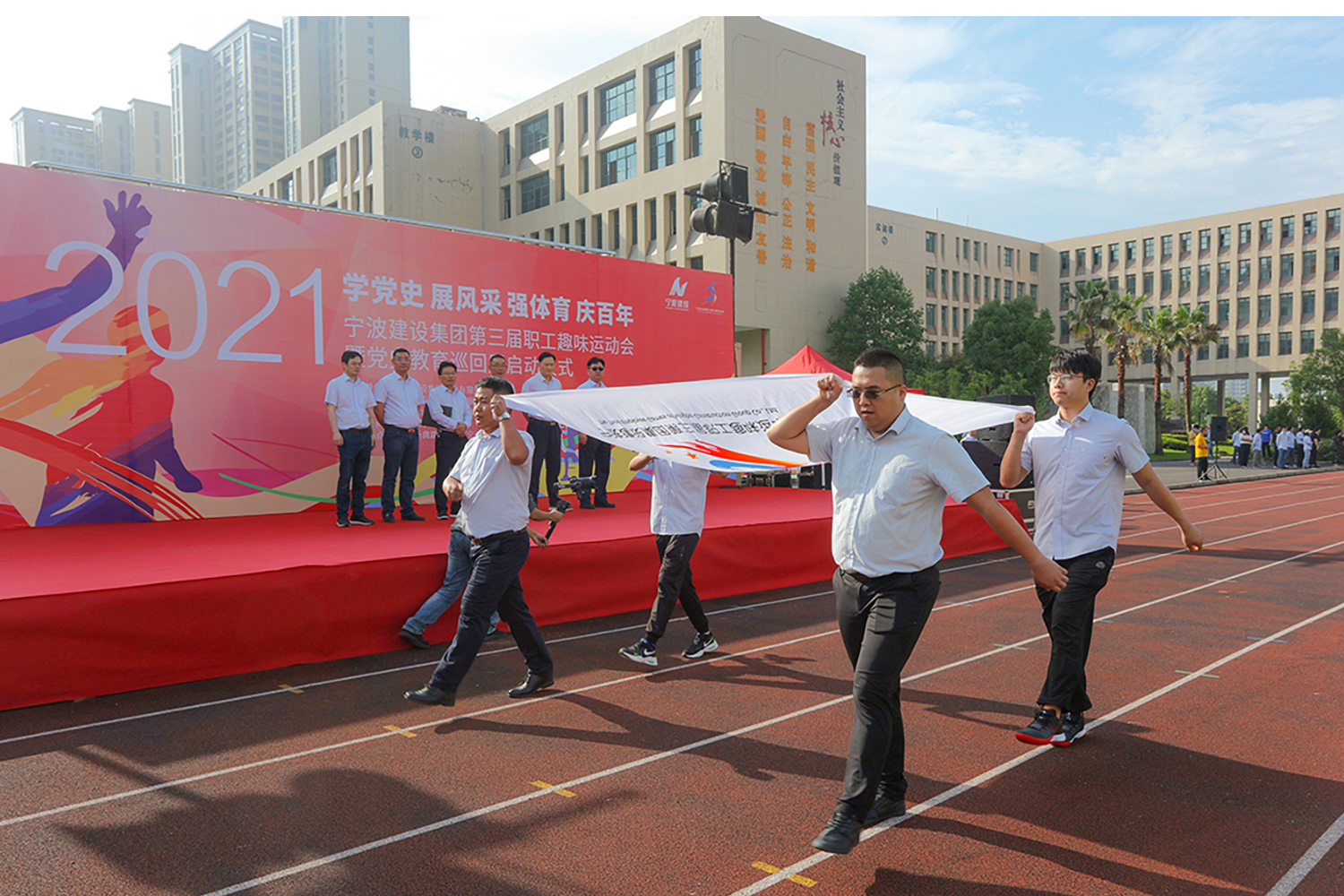 ? ? ? ?集團公司黨委副書記、工會主席苗志春在開幕式上致辭,他表示這次黨建主題運動會是集團打造黨建文化宣傳陣地、營造黨史學習教育氛圍的創新實踐,也是探索發揮黨建引領作用,激發職工群體活力的生動嘗試。寧波建設集團將繼續把黨史學習教育活動與貫徹習近平新時代中國特色社會主義思想結合起來,與慶祝建黨100周年活動結合起來,為慶祝建黨百年展現寧波建設不忘初心、繼續奮斗的精神風貌。