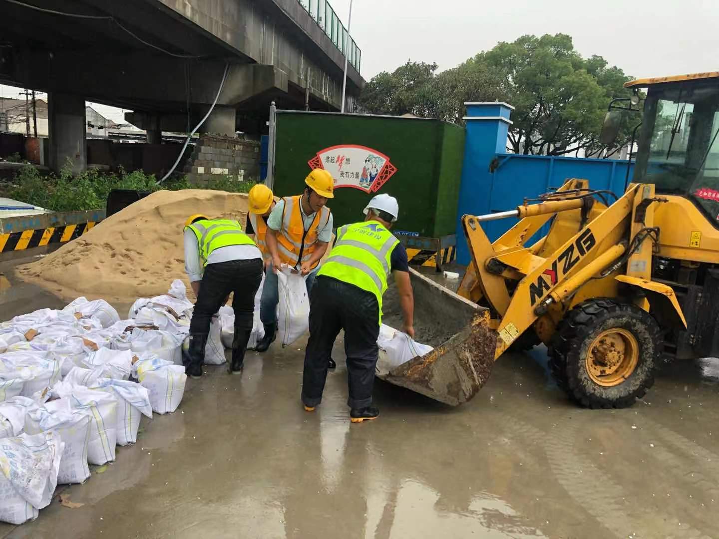 26日下午,隨著降雨量的持續增大,為避免段塘街道大河頭路部分村民民房洪水倒灌,鄞奉公園項目部主動出擊,一方面利用樹柵欄、警戒線、堆土方等所有能利用的手段封閉危險路段,另一方面項目經理王祥強帶領10余名項目管理人員組成青年突擊隊冒雨在工地現場裝袋建筑沙子,裝運至各居民房門前修筑起防洪墻,盡可能減少洪災造成的人員財產損失。“感謝你們,這樣我們就安心了”,村民對冒雨奮戰的搶險隊員們連聲道謝。