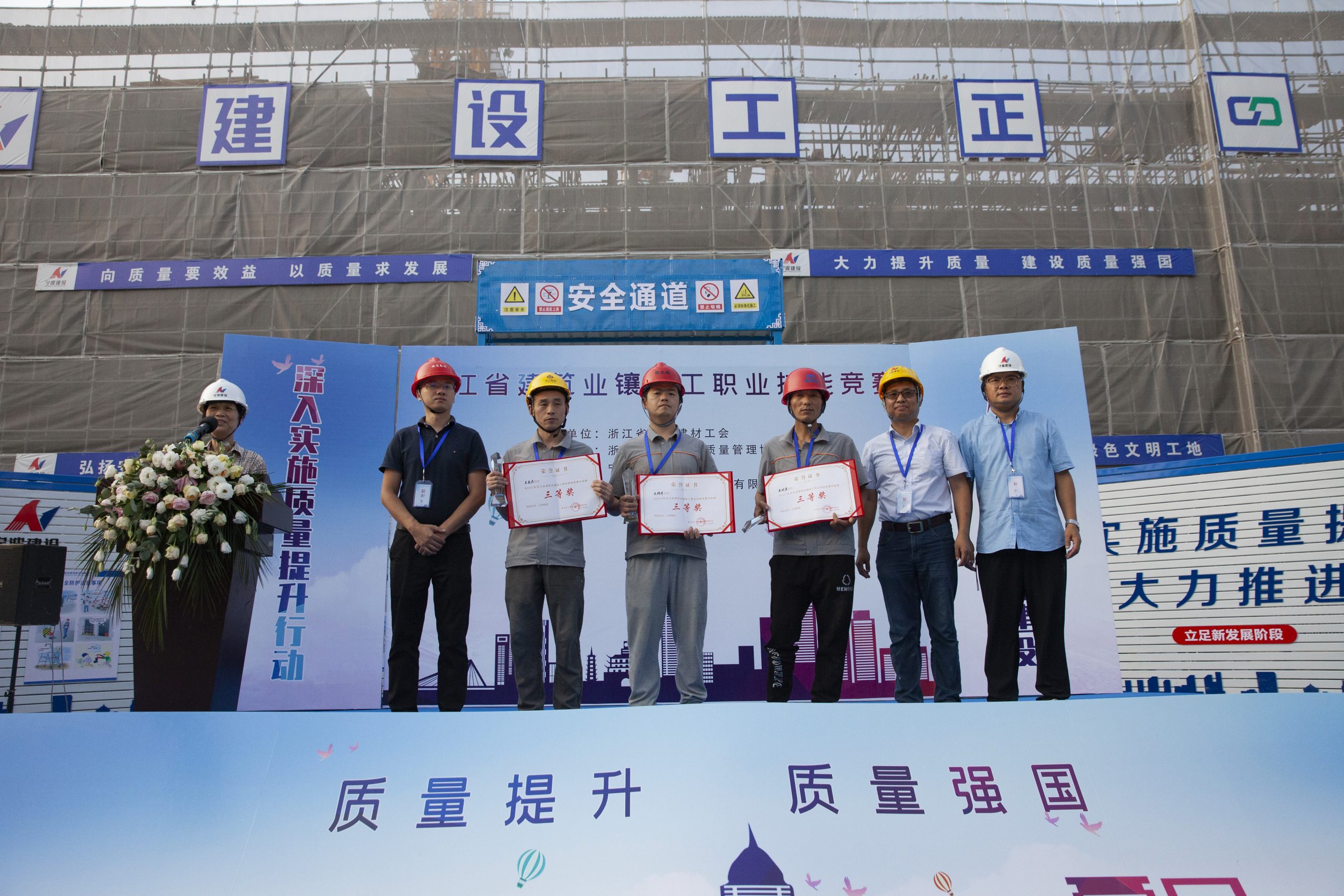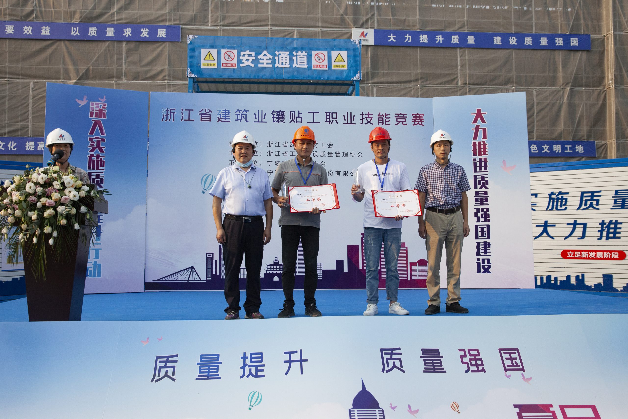 ? ? ?此外,當天在新芝小學項目觀摩會現場,還舉行了全省建筑業鑲貼工職業技能競賽,共有11支鑲貼工競賽隊伍同臺競技,比拼瓷磚薄貼法工藝。比賽分為理論和實操兩塊,要求參賽者從施工規范、質量要求、裝飾構造以及對防水、防潮、防霉等處理辦法的掌握情況等方面,決出一、二、三等獎。最后通過激烈角逐,省建投代表隊獲一等獎,寧波代表隊獲得二等獎。我集團公司董事長陳繼東為獲得一等獎的選手頒獎。